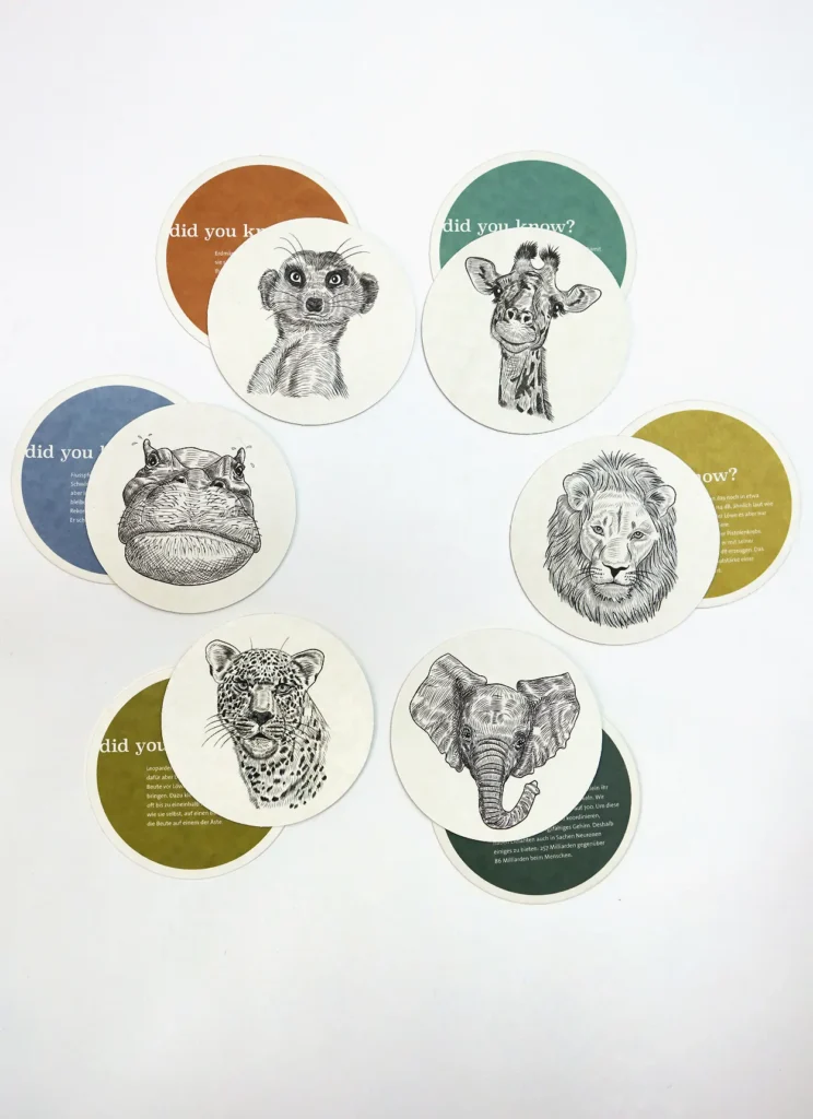 Set mit 6 Glasuntersetzern mit spannenden Fakten über 6 Tiere Afrikas