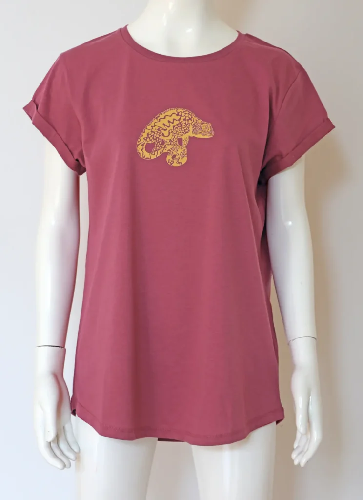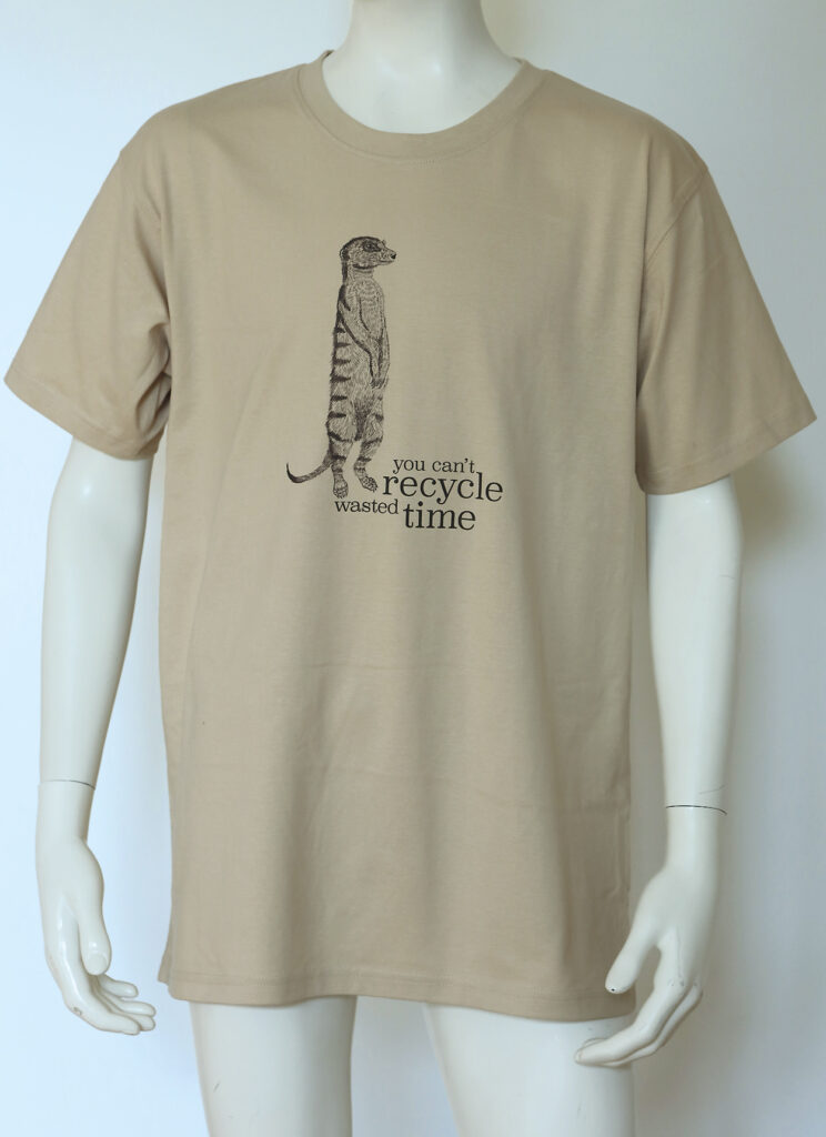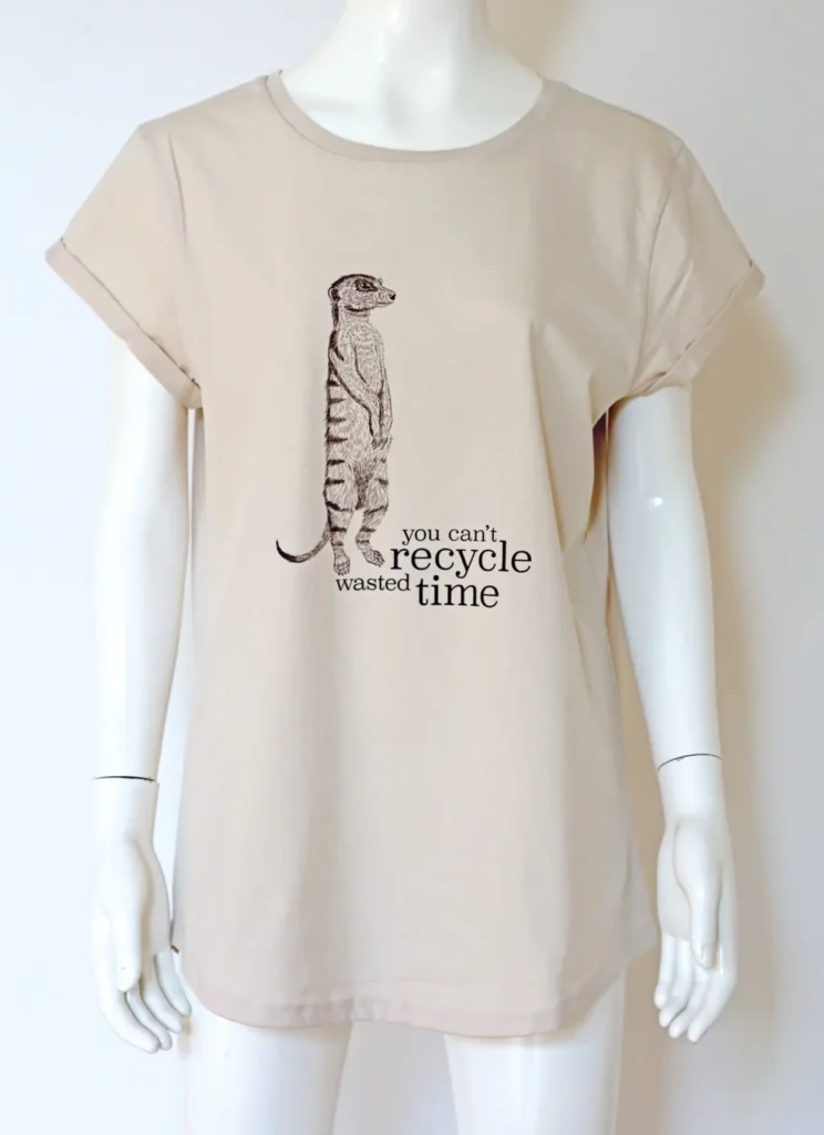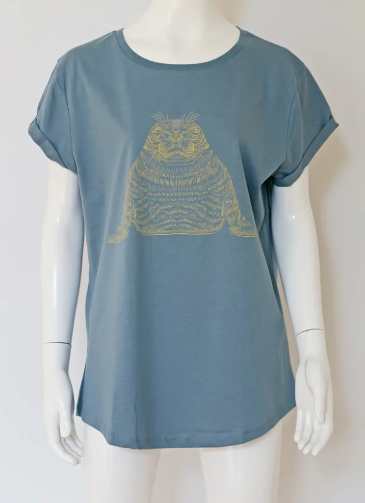 Siebdruck auf Jersey Rundhals; aufgerollte Ärmel, befestigt mit einem Riegelstich
